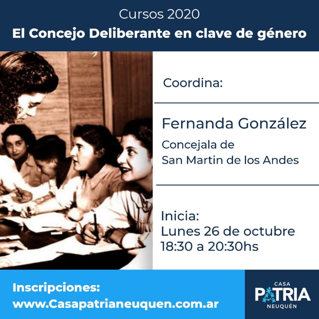 Próximamente habilitaremos las inscripciones para el Curso el Concejo Deliberante en clave de género. Comienza el lunes 26 de octubre de 18:30 a 20:30 horas. Coordina, Concejala de San Martín de los Andes Fernanda González.