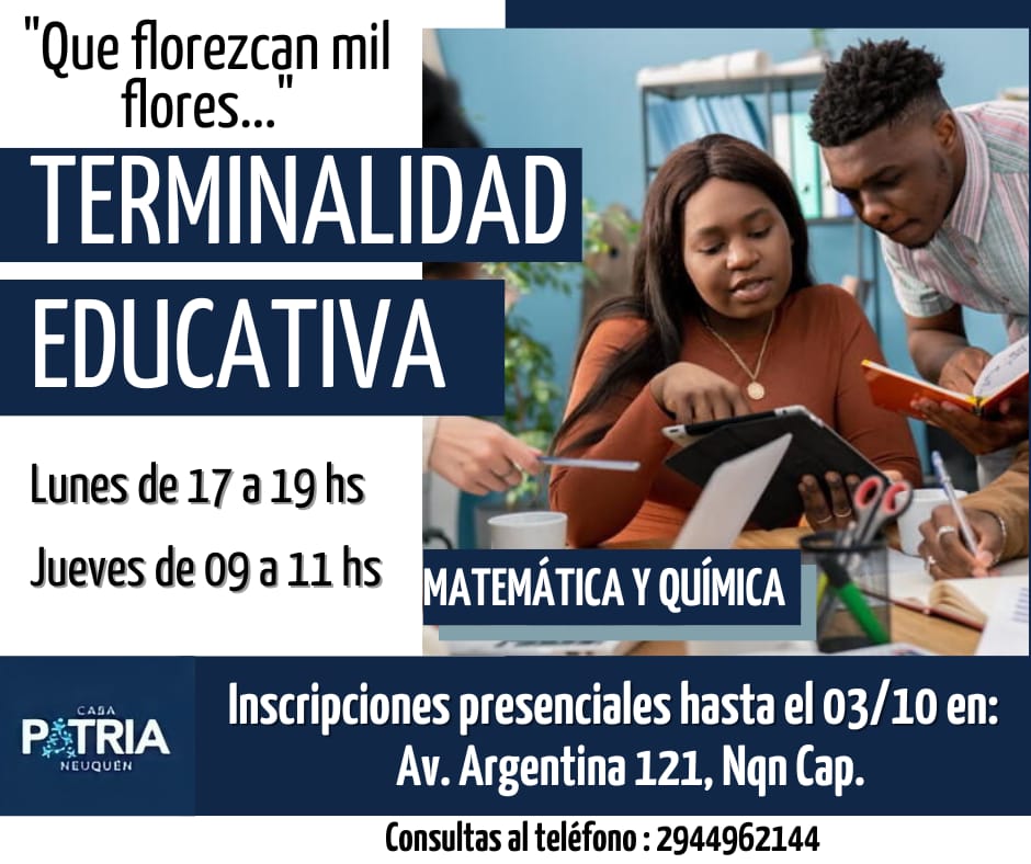 Termina tu secundario en nuestra casa. Clases de matemática y quimica. Te podes inscribir o consultar al 2944962144 Valeria. Todos se dictan en Avenida Argentina 121. Cursos arancelados. Los lunes de 17 a 19 horas o jueves de 9 a 11 horas.